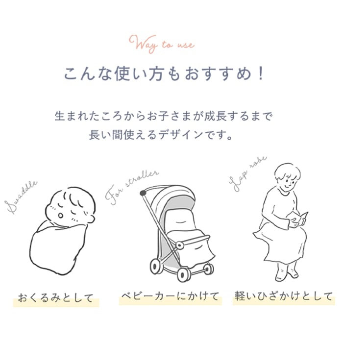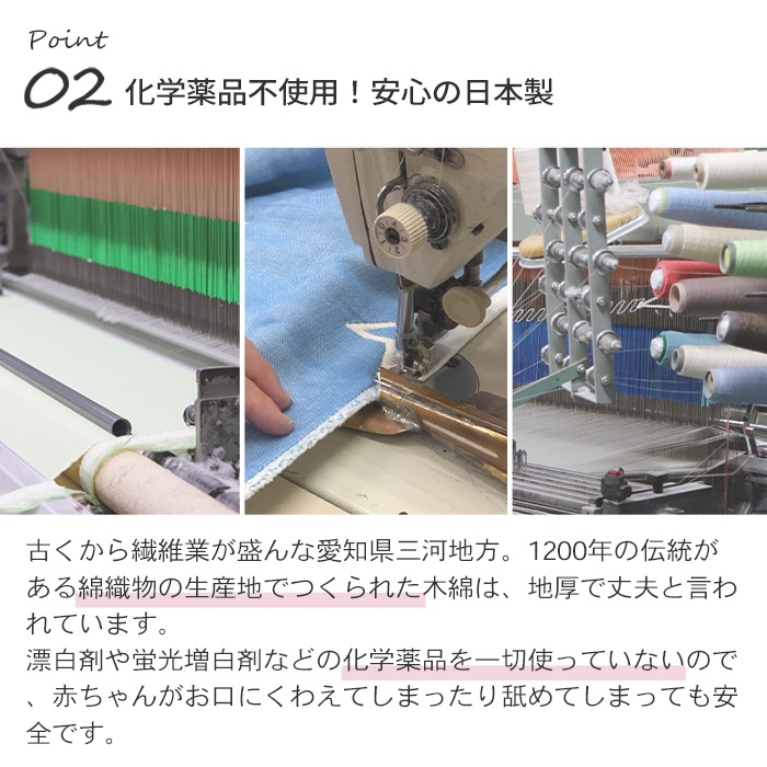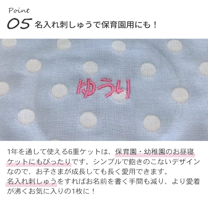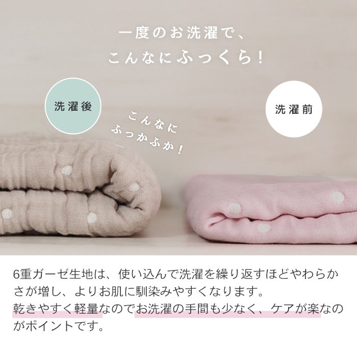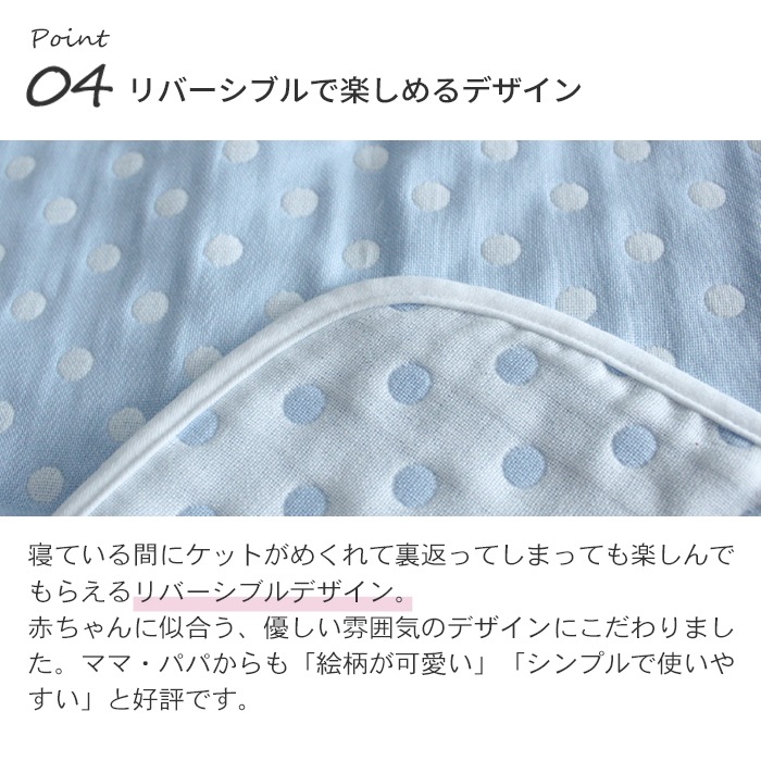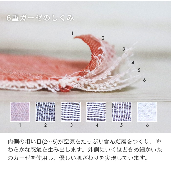 愛知県蒲郡で熟練の職人が丁寧に作り上げる三河木綿を使用した、ふんわりやわらかな6重ガーゼケット。吸水・速乾性に優れているので汗っかきの赤ちゃんでもムレにくく快適。