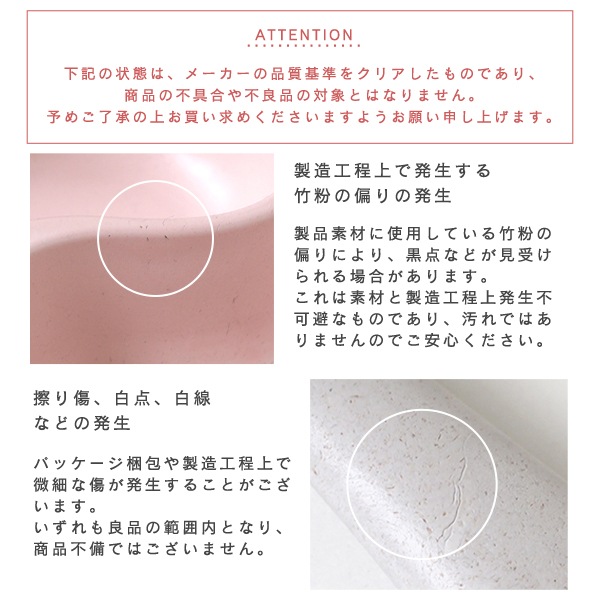 ・茶色や黒っぽい斑点が見える場合がございますが、原材料である竹の一部です。自然なものなので、一切害はありません。