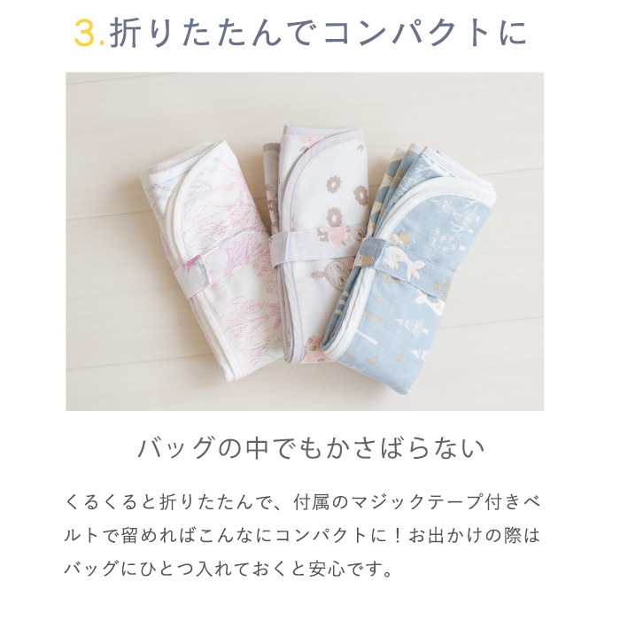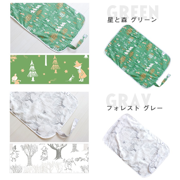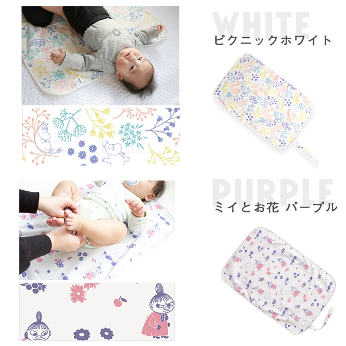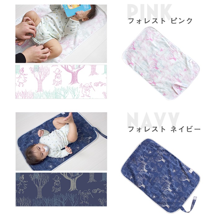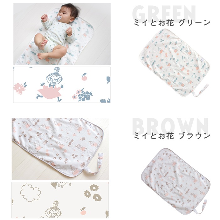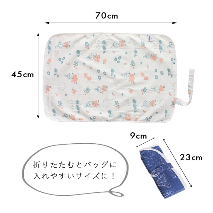 日本製の防水おむつ替えシート。肌に触れる部分は綿100%のダブルガーゼで心地よい肌触り。かわいいムーミン柄。コンパクトに畳めて外出にも便利。