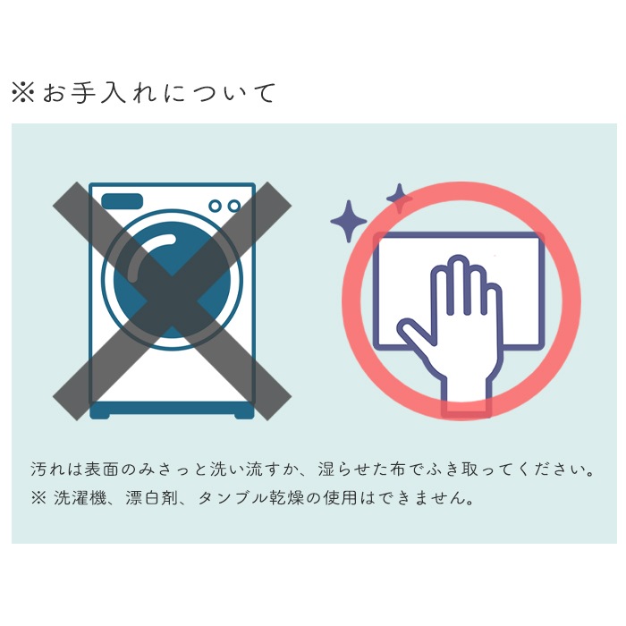 ・洗濯機、漂白剤、タンブル乾燥の使用はできません。