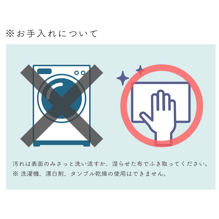 ・本体に直接水をかけないで下さい。乾燥機の使用やドライクリーニングはできません。