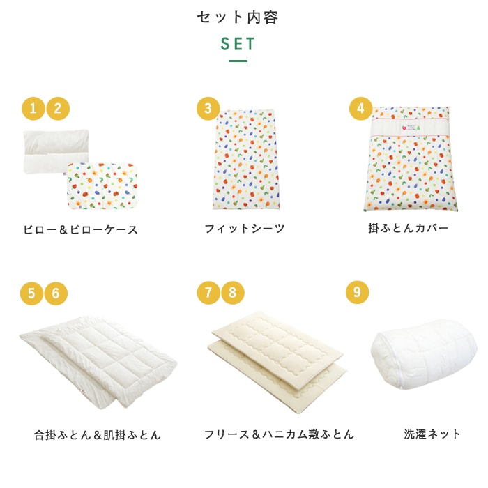 送料無料 ベビーふとん ふとんセット ベビー 布団 布団セット ふとん セット 9点 掛け布団 掛布団 敷き布団 敷布団 布団カバー 布団 カバー フィットシーツ 赤ちゃん 日本製 ダブルガーゼ ガーゼ 綿 コットン 洗濯 白 ホワイト カラフル フルーツ